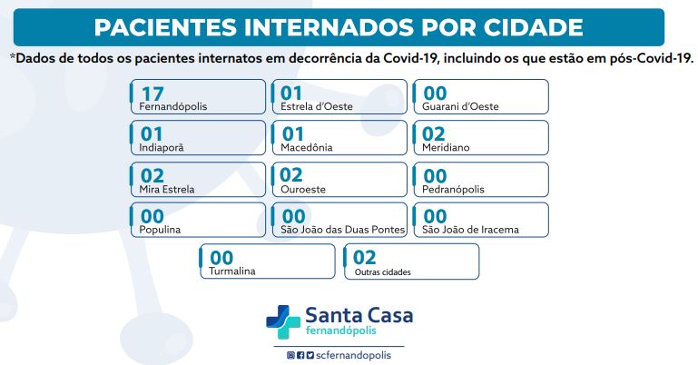 Os dados constantes no informativo referem-se ao registro do número de pacientes internados no horário base de sua elaboração, conforme controle do Núcleo Hospitalar de Epidemiologia da Santa Casa Fernandópolis.