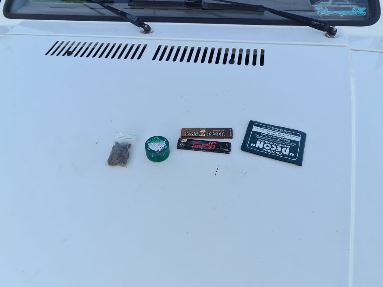 Durante revista pessoal aos indivíduos que estavam assistindo, foi localizado no interior de uma pochete, aproximadamente 12,97 gramas de maconha, um dichavador e 50 papéis de seda. Realizada revista pessoal no condutor da moto, nada de ilícito foi verificado, porém, ao efetuar a pesquisa veicular, foi constatado que a moto se tratava de produto de furto ocorrido pelo município de Dirce Reis na data de 09 de março, tendo o condutor alegado que adquiriu a moto pelo valor de R$ 100,00 naquele mesmo dia.