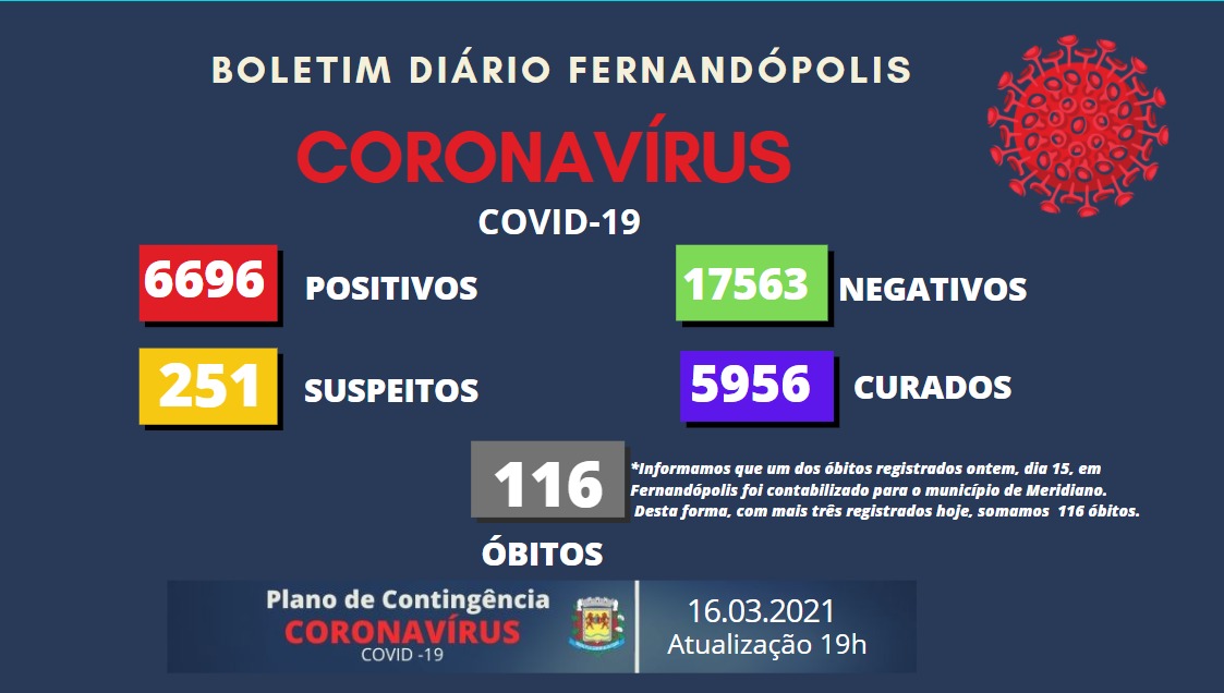 Segundo o boletim, um dos óbitos registrados na segunda-feira, dia 15, em Fernandópolis, foi contabilizado agora para o município de Meridiano. Desta forma, com os 3 óbitos desta terça-feira, o município chega a 116 mortes.