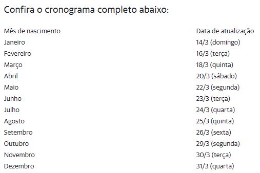 O calendário de atualização seguirá um cronograma escalonado, conforme o mês de nascimento dos clientes. O cronograma começou no domingo, 14, para os nascidos em janeiro e encerrará em 31 de março, para os nascidos em dezembro.