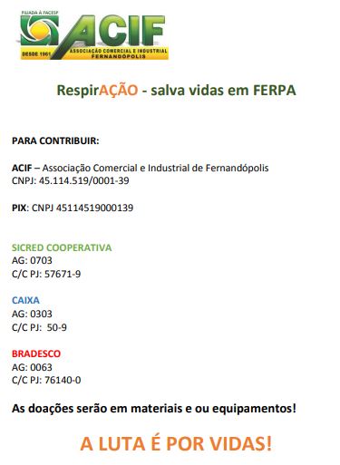 A campanha se chama “RespirAção - Salva vidas em Ferpa” e de acordo com o presidente da Acif, Saulo Marin, é aberta à toda cidade e não apenas aos comerciantes e empresários. Saulo frisou também que não existe um valor para a doação, a pessoa pode ajudar como puder. “O momento é de lutar pela vida dos fernandopolenses". afirmou Saulo