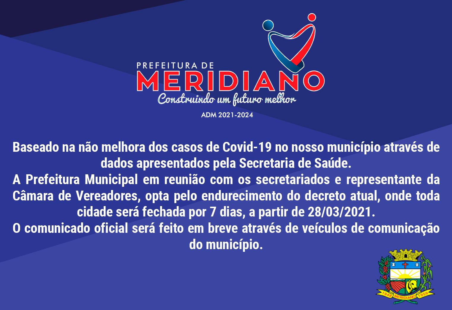 Nesta quarta-feira, dia 24, a Prefeitura de Meridiano, município localizado a 14 quilômetros de Fernandópolis, em reunião com os secretariados e representante da Câmara de Vereadores, optou pelo endurecimento do atual decreto municipal.