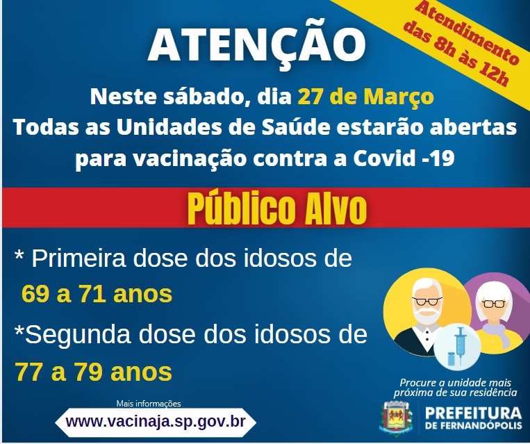 Todas as unidades de Saúde de Fernandópolis estarão abertas na manhã do próximo sábado, 27, para realizarem a imunização em grupos determinados pelo Ministério da Saúde. O atendimento ao público será das 08h às 12h.