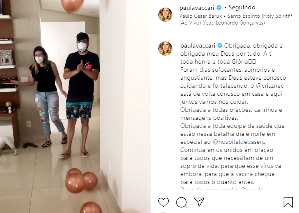 Nas redes sociais, Paula agradeceu as orações dos fãs e o trabalho da equipe médica do hospital. "Obrigada a todas orações, carinhos e mensagens positivas. Obrigada a toda equipe de saúde que estão nessa batalha da e noite, em especial ao @hospitaldebaserp", escreveu.