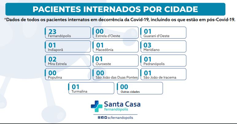 Os dados constantes no informativo referem-se ao registro do número de pacientes internados no horário base de sua elaboração, conforme controle do Núcleo Hospitalar de Epidemiologia da Santa Casa Fernandópolis.