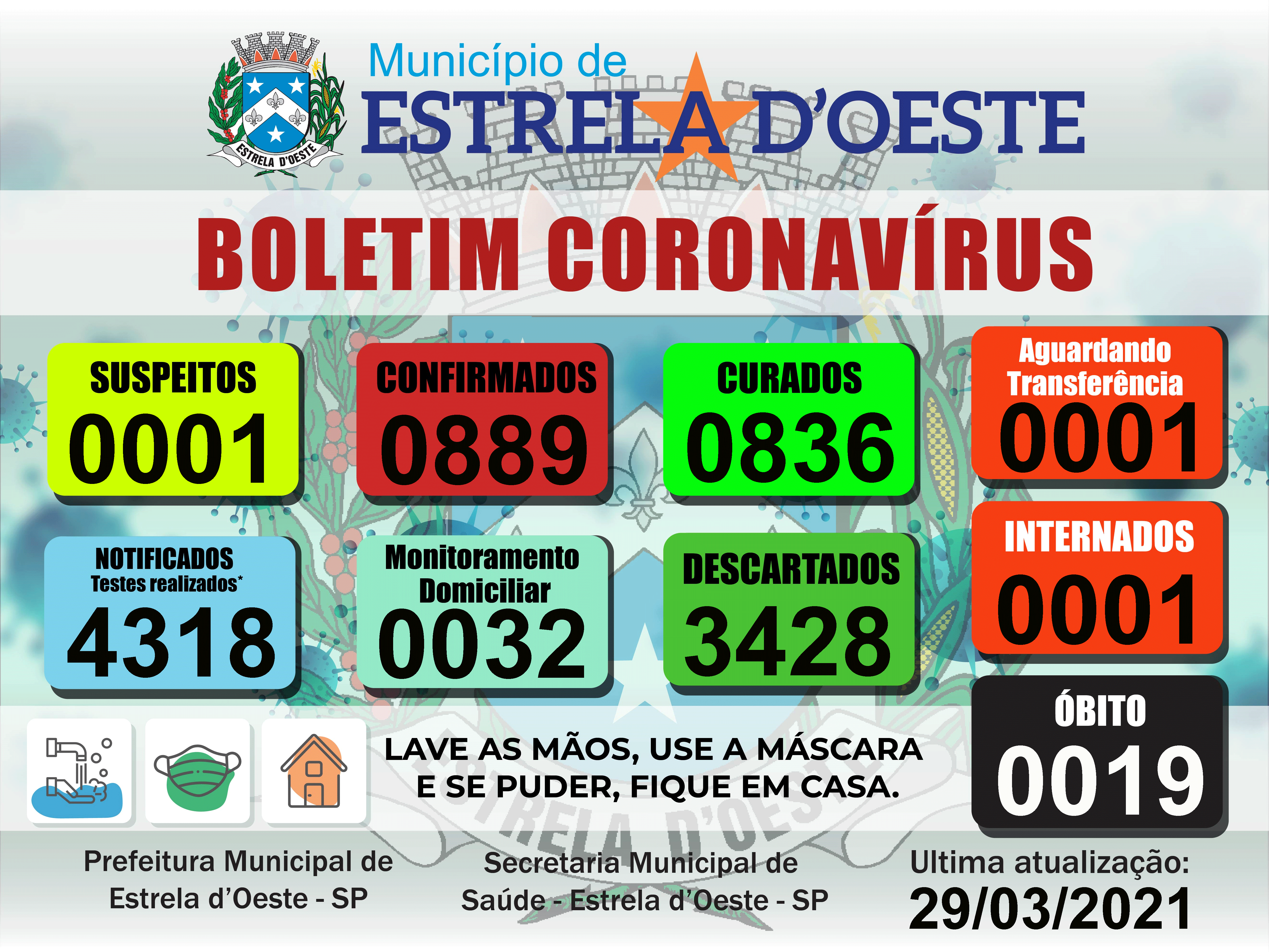 Estrela d´Oeste, município localizado a 17 quilômetros de Fernandópolis, registrou mais casos positivos de coronavírus (Covid-19), nesta segunda-feira, dia 29, de acordo com o boletim epidemiológico, divulgado pela Prefeitura.