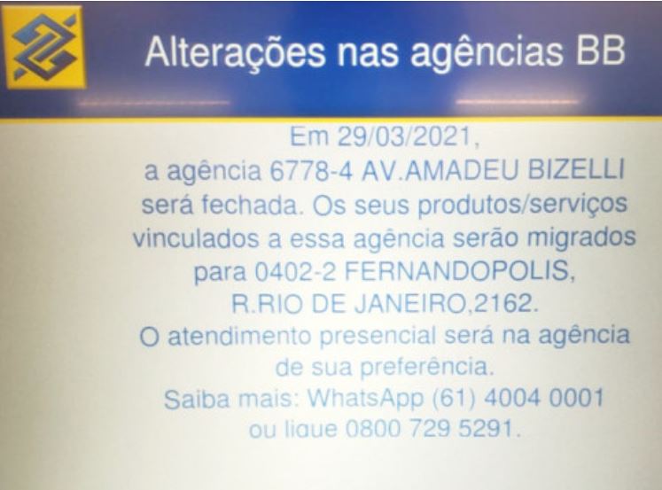 Informações dão conta de que uma dessas agências, que foram desativadas, é a de Fernandópolis, situada na Avenida Amadeu Bizelli, na região central do município. Segunda-feira, dia 30, foi o último dia que a agência ficou aberta.