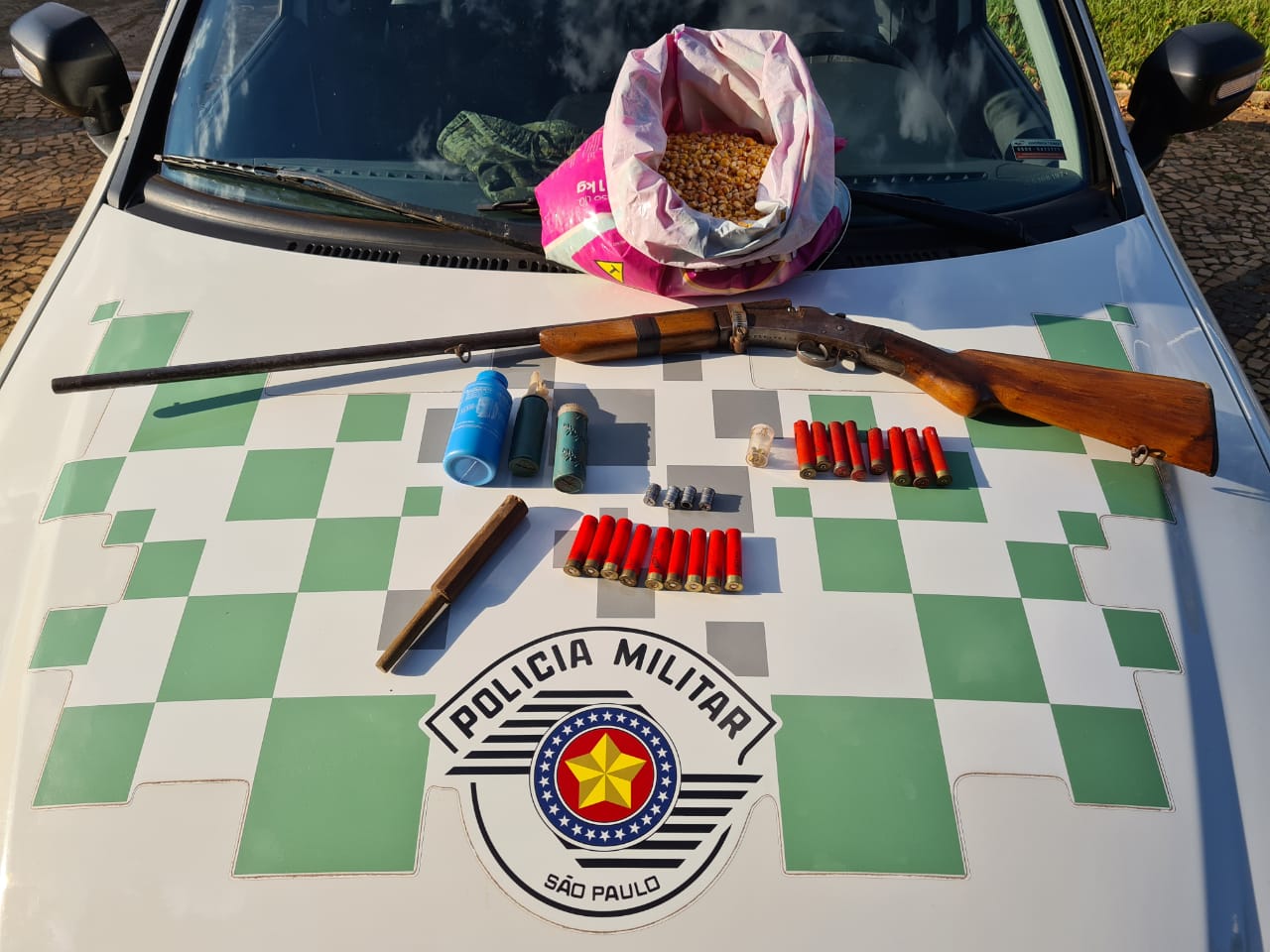 Indagado se possuía arma de fogo para a prática da caça, o suspeito confessou que possuía uma espingarda calibre 32, munições e materiais para recarregar cartuchos, mas que não haviam sido utilizados, pois fazia pouco tempo que estava morando no município.