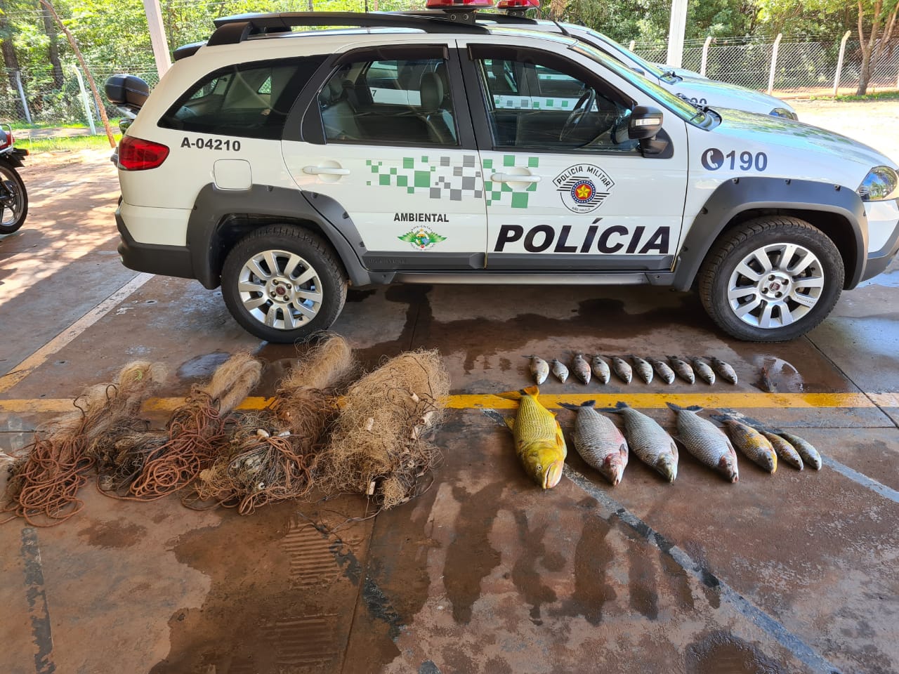 Durante Policiamento Ambiental realizado neste domingo, 11, referente a Operação “Toque de Restrição”, nas proximidades do Rio São José Dos Dourados, pelo município de Floreal, por volta das 05h30min da manhã, policiais militares ambientais avistaram três indivíduos adentrarem a mata ciliar, e após algum tempo saíram carregando alguns sacos; ao efetuarem a abordagem e revista pessoal, localizaram quatro redes de nylon duro, totalizando ao todo 105 metros de comprimento, e 23,62kg de pescados das espécies; dourado, curimbatá, piauçu, piau-três-pintas e cascudo.