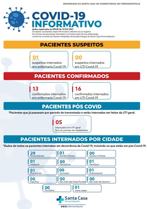 Os dados constantes no informativo referem-se ao registro do número de pacientes internados no horário base de sua elaboração, conforme controle do Núcleo Hospitalar de Epidemiologia da Santa Casa Fernandópolis.