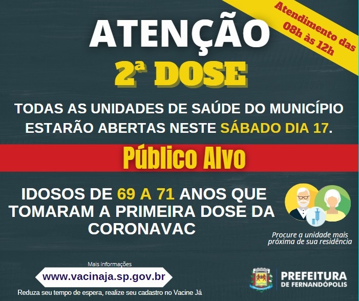 Todas as Unidades de Saúde de Fernandópolis abrem neste sábado, 17, para vacinação contra a COVID. O público alvo imunizado será formado pelos idosos com idade entre de 69 a 71 anos que tomaram a primeira dose da coronavac. Para receber a vacina, basta levar um documento pessoal e a caderneta de vacinação entregue no ato da primeira dose.
