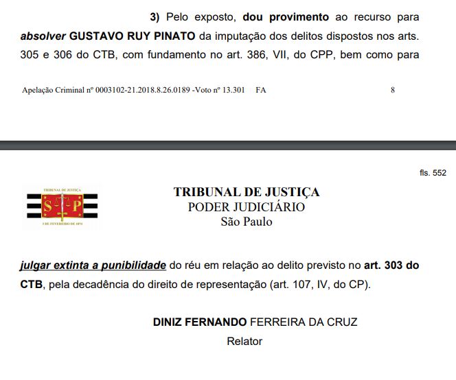 Na sentença do TJ, Gustavo Pinato foi absolvido da acusação e teve extinta a punibilidade aplicada pelo juízo de primeira instância.