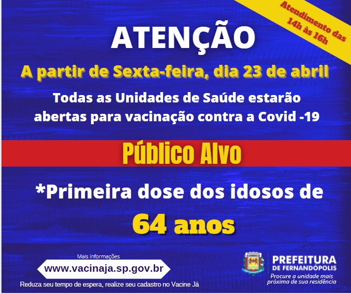 A campanha de vacinação contra a Covid-19 em Fernandópolis continua avançando de acordo com o calendário estabelecido pelo Ministério da Saúde e Secretaria Estadual de Saúde. Nesta sexta-feira, 23, todas as Unidades Básicas de Saúde do município estarão abertas para atendimento dos idosos com 64 anos de idade.