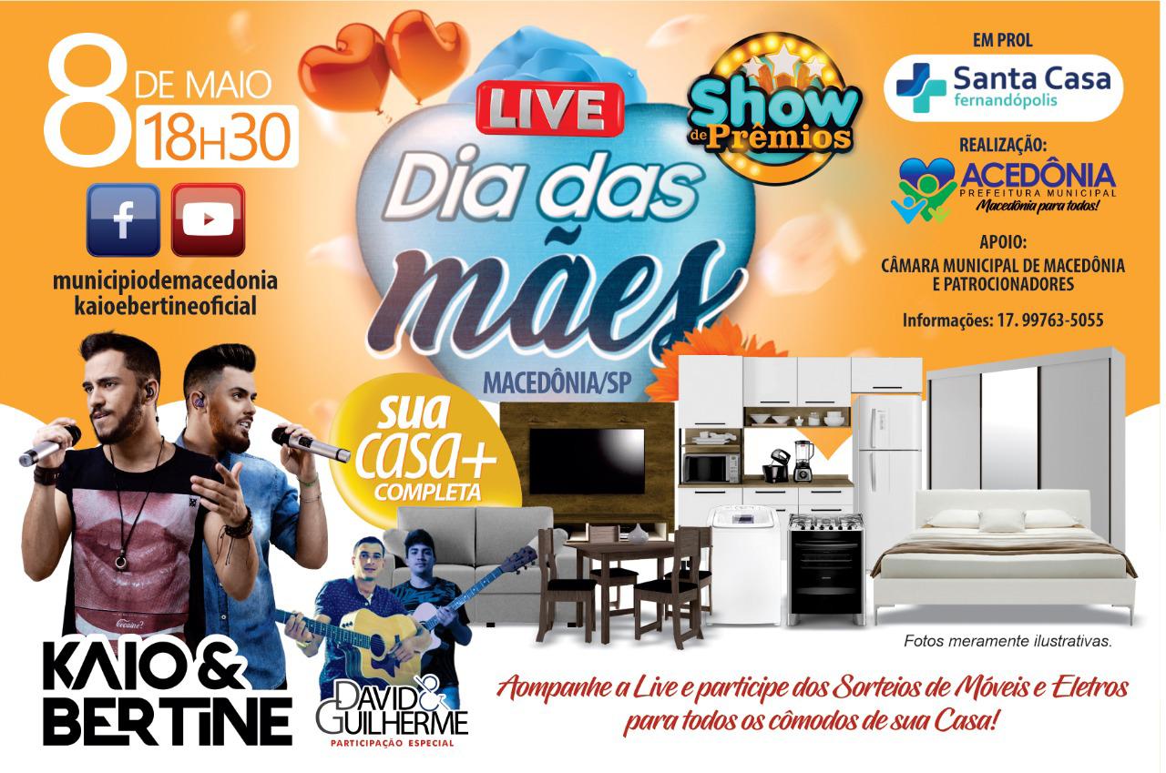 Em comemoração ao dias das mães, o município de Macedônia realizará no próximo sábado, 08 de maio, a live beneficente com show da dupla Kaio & Bertini. Além de colaborar com a Santa Casa de Fernandópolis as mães do município concorrerão através de sorteio a prêmios de uma casa completa entre móveis e eletrodomésticos.