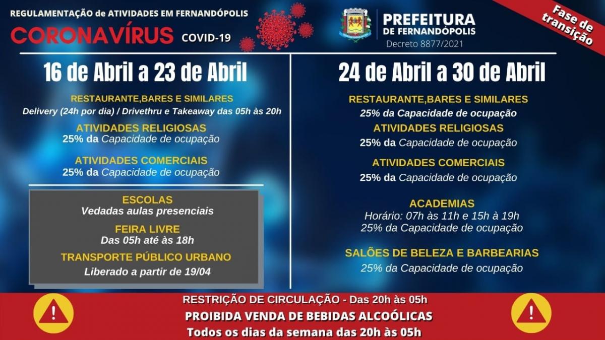 De acordo com as regras vigentes em todo o Estado de São Paulo, a fase de transição vai até o dia 1° de maio. Vale ressaltar, no entanto, que o toque de recolher noturno, das 20h às 5h, está mantido até, no mínimo, o dia 1° de maio.