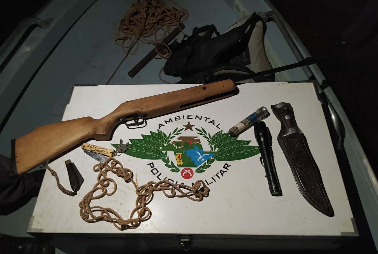 Após abordagem e revista pessoal, foi localizado em posse dos indivíduos, uma espingarda de pressão adaptada para calibre .22, várias munições intactas e petrechos utilizados na prática de caça (faca, corda e lanterna).