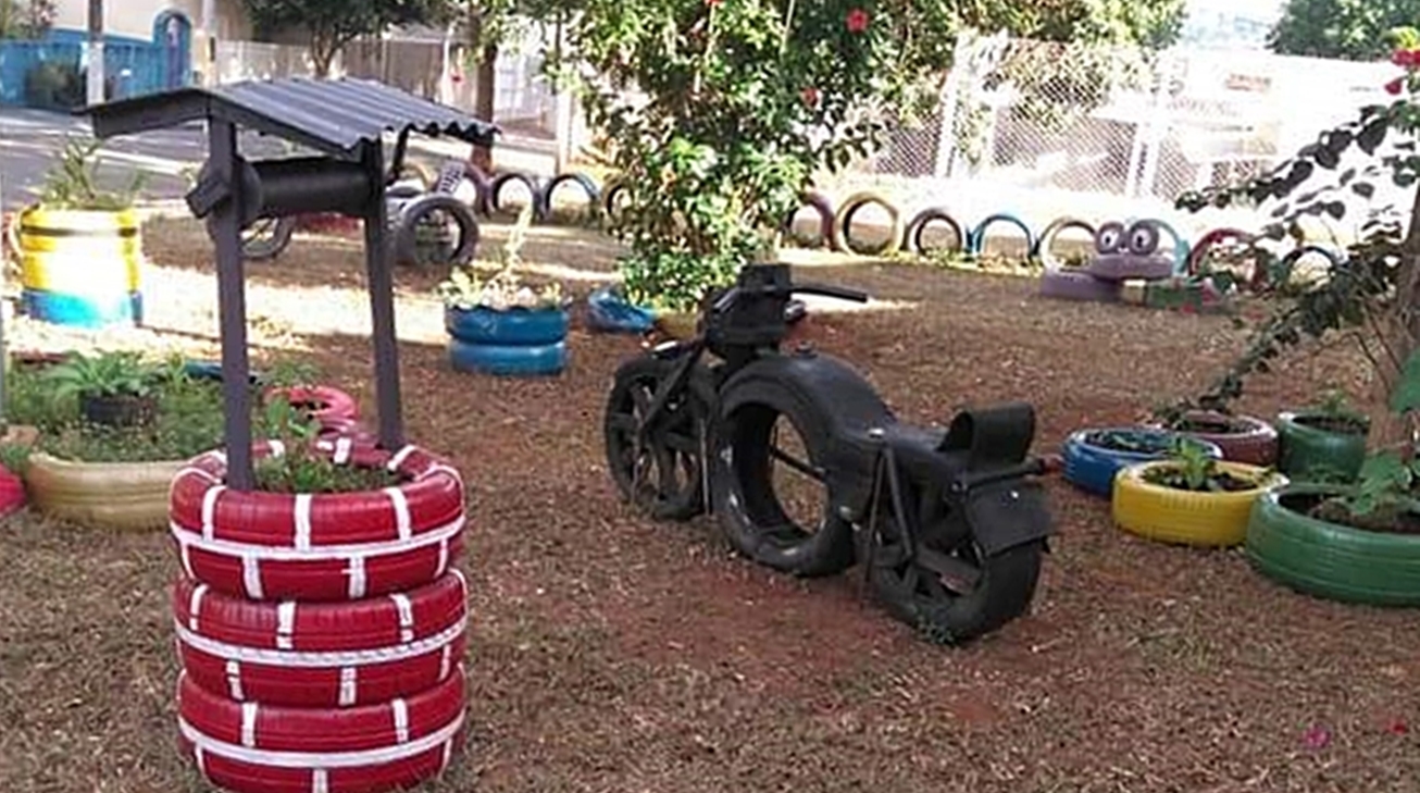 Foram utilizados diversos pneus para decoração, doados pela empresa Ale Rodas. Com os pneus a Silvana criou desde vasos personalizados para as plantas, além de uma moto e um triciclo de decoração, que deram um ar especial para o ambiente.
