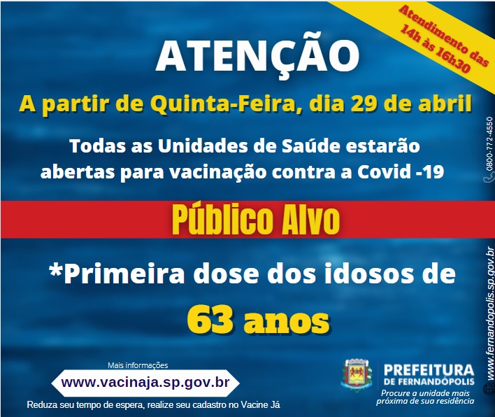 Em Fernandópolis, todas as Unidades Básicas de Saúde do estarão abertas para atendimento das pessoas com 63 anos. A vacinação vai acontecer no horário das 14h às 16h30.