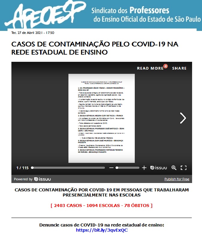A APEOESP divulga em seu site, uma relação de casos confirmados e óbitos, com nome de todas as escolas, identificando cada município, e mostra um número superior ao informado na matéria da Agência Brasil: seriam 78 óbitos. Essa relação teve sua mais recente atualização no último dia 27.