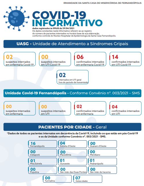 Os dados constantes no informativo referem-se ao registro do número de pacientes internados no horário base de sua elaboração, conforme controle do Núcleo Hospitalar de Epidemiologia da Santa Casa Fernandópolis.