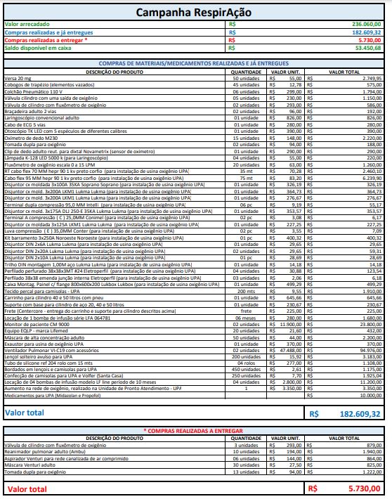Outra informação confirmada por Saulo foi a de que “99%” do dinheiro arrecadado foram destinados à UPA. Uma das doações foi no valor de R$ 575,00 para a construção da usina de oxigênio da Unidade de Pronto Atendimento.