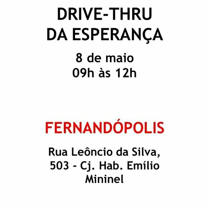 Será o “Drive-Thru da Esperança”, das 9h às 12h. Esta iniciativa contará com a participação de músicos do projeto social “Os Sonhadores”. Ao parar seu carro para entregar sua doação, receberá um agradecimento especial através de boa música, ao som de violino e muita esperança por dias melhores.