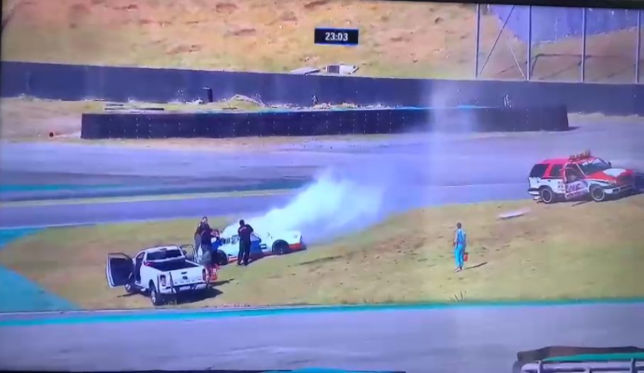 Momento em que o carro de Reinaldo Cangueiro pega fogo na etapa de Interlagos