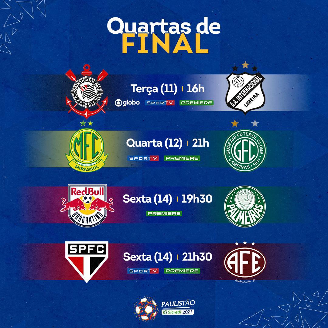 A FPF (Federação Paulista de Futebol) definiu, na manhã desta segunda-feira (10), as datas e os horários dos jogos das quartas de final do Campeonato Paulista