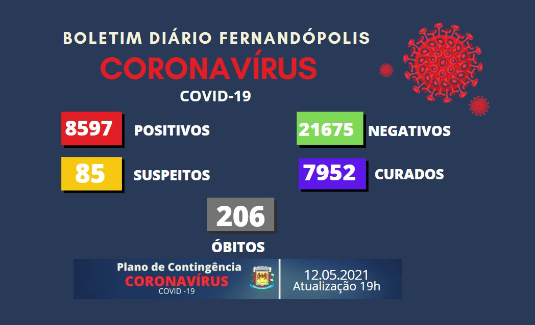 O informativo traz ainda 21.675 testes negativos e 7.952 pacientes curados da doença. Os casos tratados como suspeitos são 85. Fernandópolis já registrou 206 mortes devido a complicações da Covid-19.