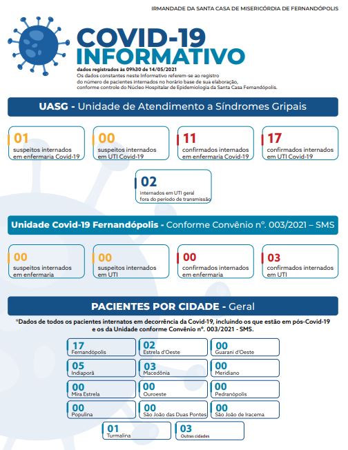 Os dados constantes no informativo referem-se ao registro do número de pacientes internados no horário base de sua elaboração, conforme controle do Núcleo Hospitalar de Epidemiologia da Santa Casa Fernandópolis.