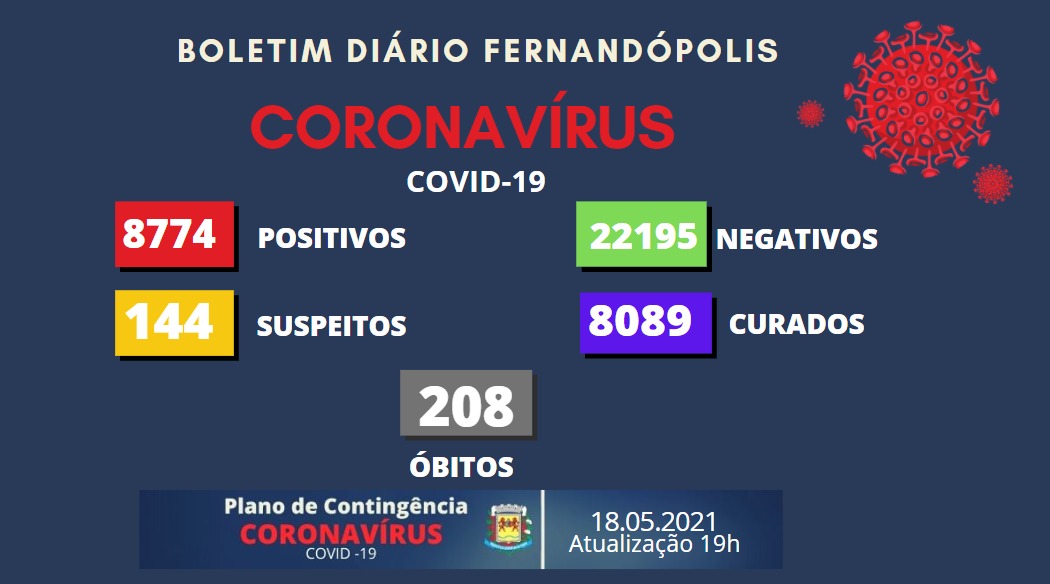 O informativo traz ainda 22.195 testes negativos e 8.089 pacientes curados da doença. Os casos tratados como suspeitos são 144. Em Fernandópolis, 208 pessoas já morreram devido a complicações da Covid-19.