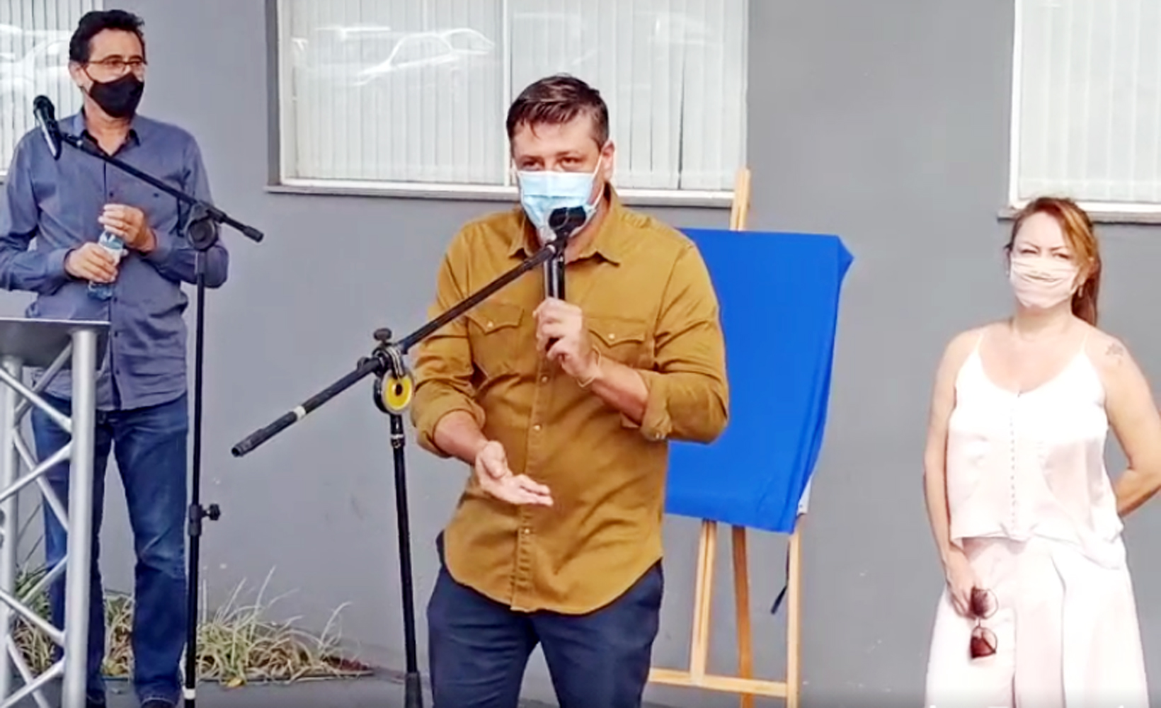 Assessor Humberto Machado, Prefeito Pessuto e primeira dama Mara Cândido durante as inaugurações desta sexta-feira, 21. Imagem: Facebook
