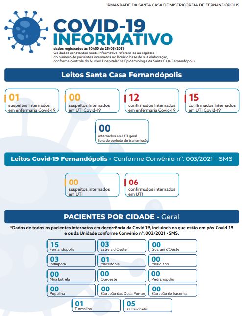 Os dados constantes no informativo referem-se ao registro do número de pacientes internados no horário base de sua elaboração, conforme controle do Núcleo Hospitalar de Epidemiologia da Santa Casa Fernandópolis.