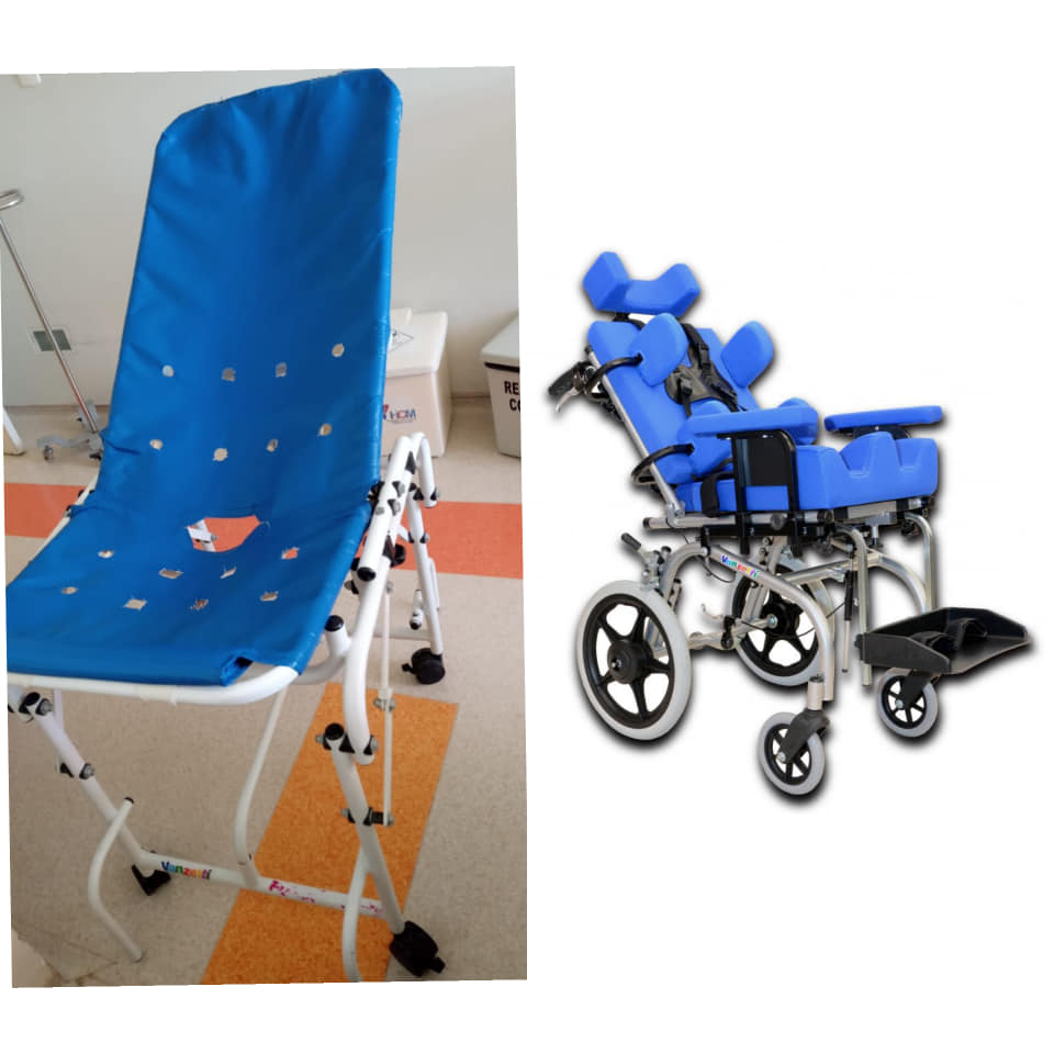 A ajuda também pode ser por meio de doações, como uma cadeira de banho e uma cadeira de locomoção