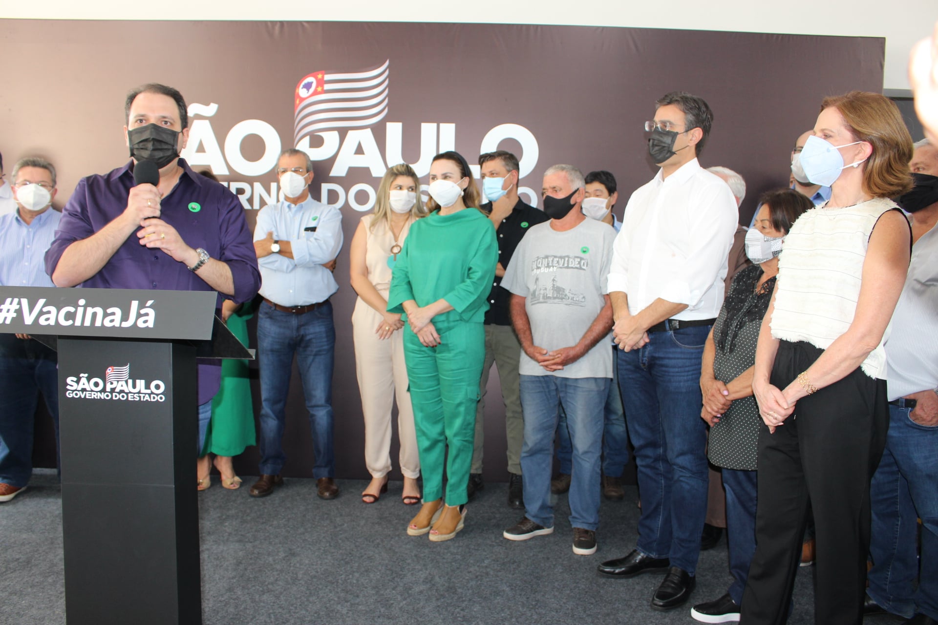 Prefeito Luis Henrique, vice-governador Rodrigo Garcia, presidente Carlão Pignatari, durante o cerimonial. Foto: Sec. Comunicação Jales