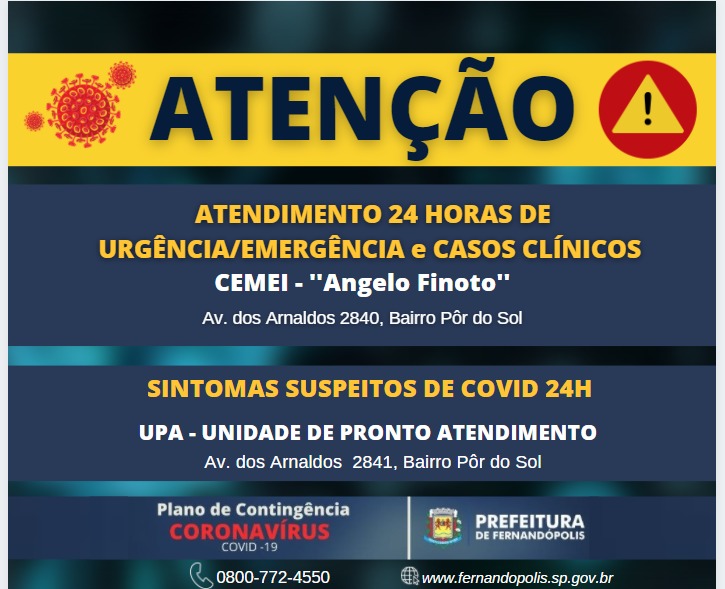 A Prefeitura de Fernandópolis, por meio da Secretaria Municipal de Saúde, comunica que a partir desta quarta-feira, 02 de junho, estará atendendo todos os casos de URGÊNCIA e EMERGÊNCIA 24H da UPA na ESCOLA “ÂNGELO FINOTO”, localizada na avenida dos Arnaldos, (ao lado da própria UPA).