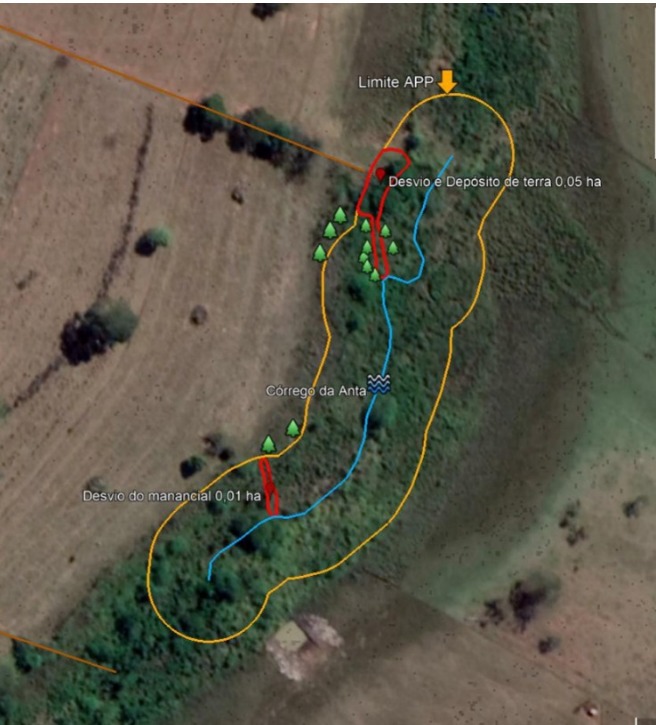 Pelo local foi constatado o corte de 13 árvores, sendo 5 embaúbas, 8 árvores situadas em área considerada de Preservação Permanente, bem como verificaram também uma pequena barragem no citado córrego, realizado através da utilização de lascas arbóreas, diminuindo o fluxo de água do manancial para as propriedades lindeiras, havendo também a construção de dois desvios de água do córrego para o interior do tanque escavado, atingindo no total 0,02 hectare de vegetação natural em área considerada de preservação permanente, além do depósito de sedimentos oriundos do tanque escavado que atingiu 0,04 hectare de vegetação natural em área considerada de preservação permanente, não possuindo o proprietário autorização do órgão ambiental competente para tais finalidades.
