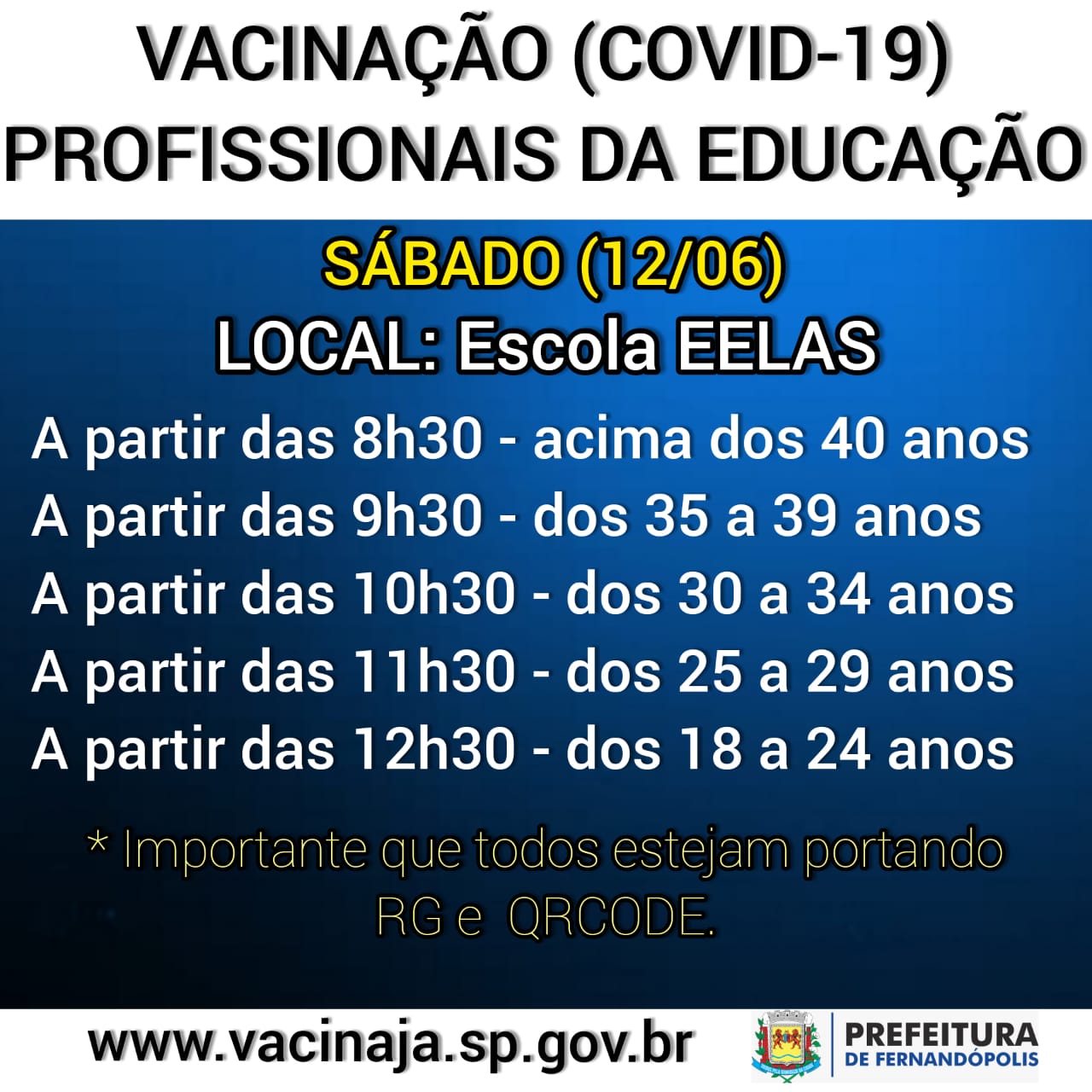 Com intuito de facilitar a ação, mantendo todas as normas de segurança com distanciamento e evitando a aglomeração, a Prefeitura de Fernandópolis, por meio das Secretarias de Saúde e Educação elaborou um cronograma de vacinação para este sábado, dia 12 de junho.