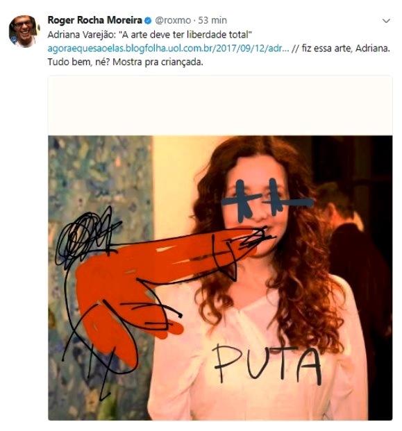 Roger usou uma foto da artista como base e desenhou cruzes nos seus olhos e um pênis em direção à sua boca. Na camiseta de Adriana, o cantor escreveu "puta". Na legenda, ironizou a fala dela em uma entrevista: "a arte deve ter liberdade total". "Gostou dessa, Adriana?", escreveu o músico.