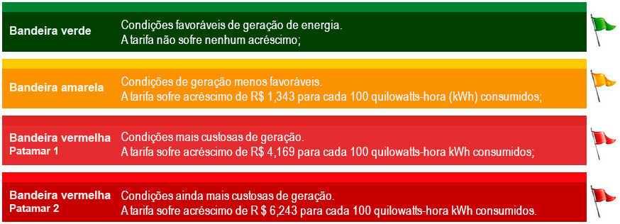 Confira os valores correspondentes às cores verde, amarela, vermelha (patamar I) e vermelha (patamar II), referência atual para cobrança da conta de luz no Brasil