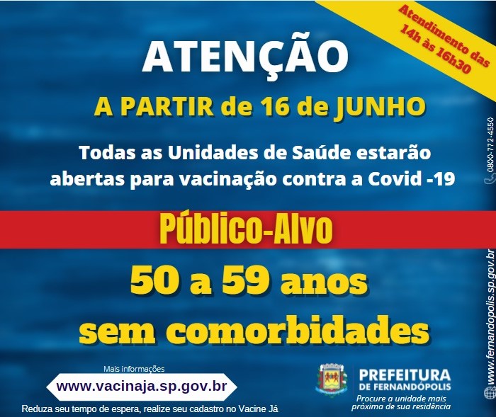 A partir desta quarta-feira, 16 de junho, passam a ser vacinadas com a primeira dose da vacina contra a Covid-19, pessoas de 50 a 59 anos sem comorbidades.