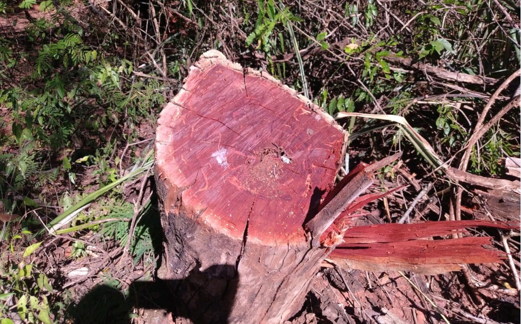 Pelo local, foi constatado o corte isolado de 10 árvores nativas das espécies “aroeira” e “angico”, estando elas secas, porém ainda em pé, em meio ao fragmento, as quais foram cortadas seletivamente e serradas no local, tendo sido o material lenhoso escoado, bem como o corte 01 árvore nativa da espécie “ipê”, o qual se encontrava inserida no fragmento florestal, ainda verde e em pé.