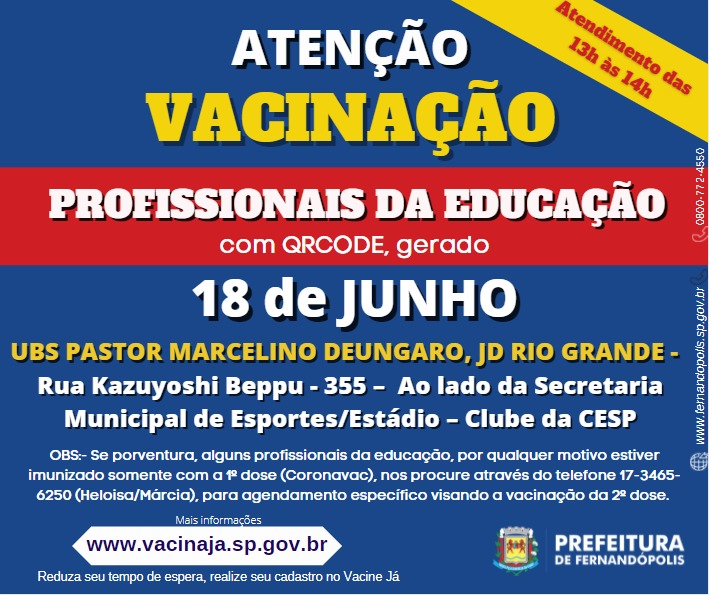 Mais informações relacionadas à vacinação de profissionais da educação, podem ser obtidas pelo telefone: 3465-6250 falar com (Heloisa/Márcia).