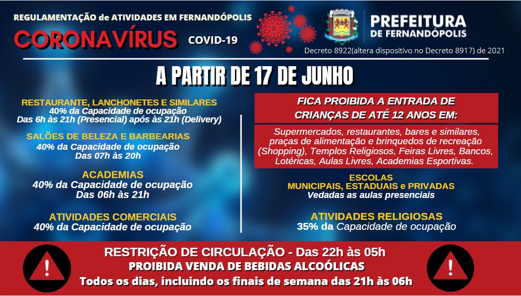 Nesta quinta-feira, 17, a Prefeitura de Fernandópolis publica o Decreto nº 8.922/2021, alterando dispositivo no decreto nº 8.917/2021, que estabelece medidas de contenção ao avanço da pandemia da Covid-19 no município. Uma das alterações está relacionada ao funcionamento de bares, restaurantes e similares que deverão fazer o atendimento presencial até às 21h, e após esse horário o serviço deverá ser restrito ao ‘Delivery’. Venda de bebidas alcóolicas também fica suspensa todos os dias à partir das 21h.