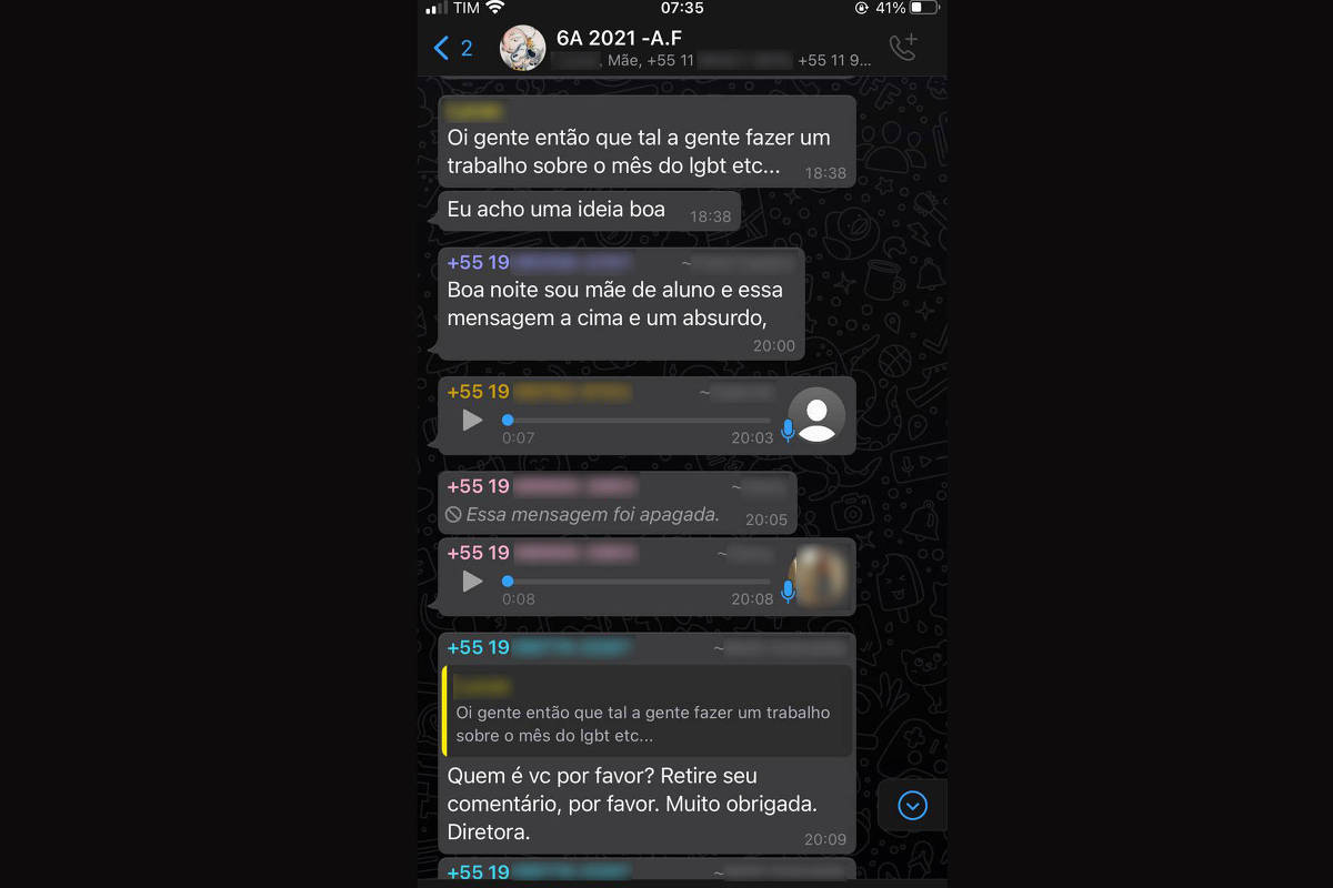 Sexta-feira (11), fim de tarde. Um aluno de 11 anos do sexto ano de uma escola pública de Campinas, no interior de São Paulo, propõe um tema de tarefa escolar para a classe, no grupo de Whastapp criado pela direção da unidade. "Que tal a gente fazer um trabalho sobre o mês do lgbt etc... Eu acho uma ideia boa."