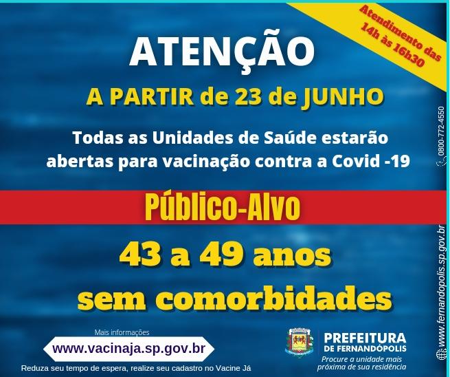 A Prefeitura de Fernandópolis vai incluir um novo público-alvo na campanha de vacinação contra a Covid-19, de acordo com o estipulado pela Secretaria Estadual de Saúde. A partir desta quarta-feira, 23, a população de 43 a 49 anos começará a ser imunizada.