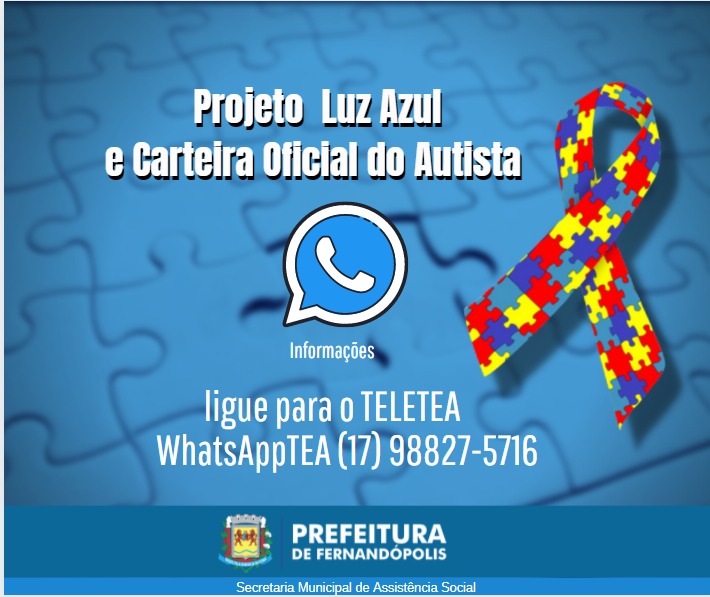 As pessoas que tiverem interesse sobre o Projeto ‘Luz Azul’ e a CIPTEA em Fernandópolis deverão agendar horário na Secretaria Municipal de Assistência Social pelo telefone 3465-0150 das 08h às 13h ou ligar para o TELETEA (17) 98827-5716