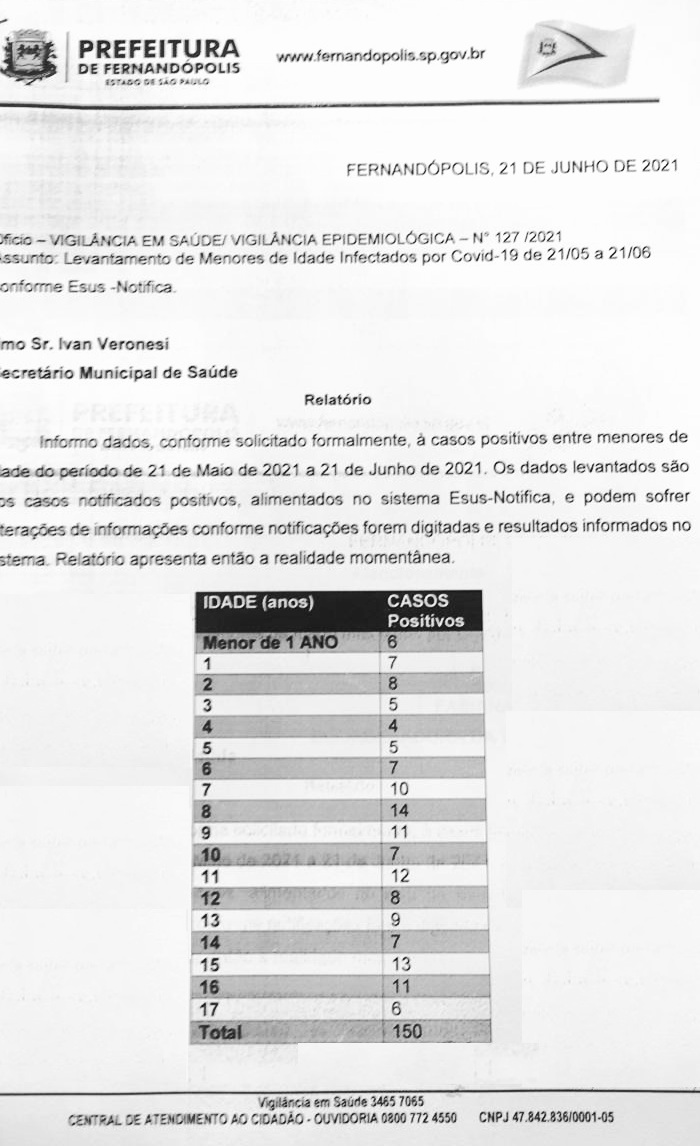 De acordo com ofício contendo levantamento da Secretaria Municipal da Saúde a que “O Extra.net” teve acesso nesta quarta-feira (23), assinado pelo secretário Ivan Veronesi, em um mês, entre 21 de maio e 21 de junho, 150 crianças e adolescentes testaram positivo para Covid-19 em Fernandópolis.