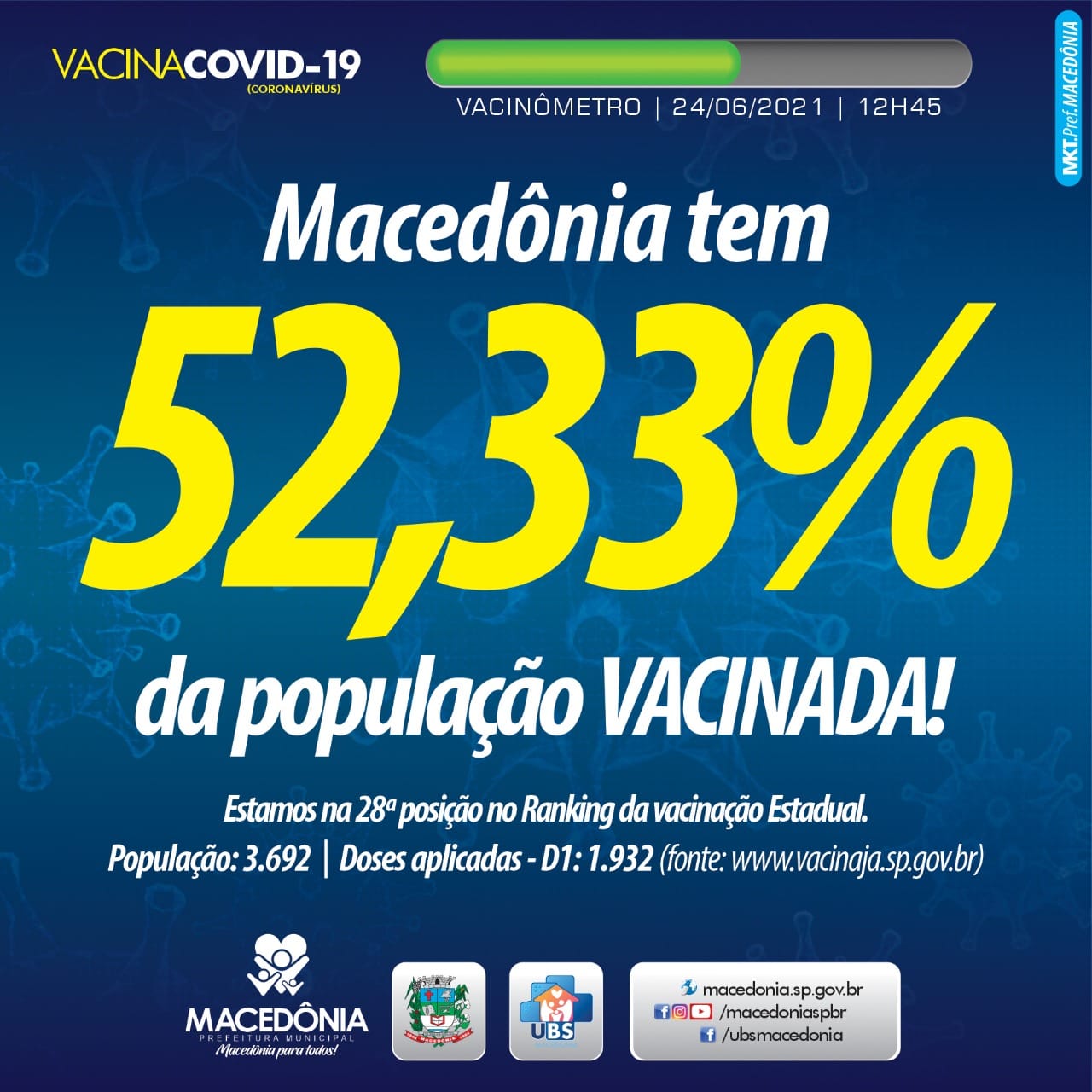 O Programa de Imunização do Governo de São Paulo, por meio do Vacinômetro, aponta que Macedônia vacinou, até o momento, 52,33% da população, com 1.932 doses aplicadas na primeira fase e 703 doses aplicadas na segunda fase da vacinação.