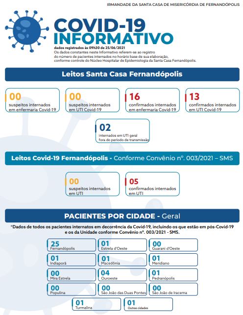 Os dados constantes no informativo referem-se ao registro do número de pacientes internados no horário base de sua elaboração, conforme controle do Núcleo Hospitalar de Epidemiologia da Santa Casa Fernandópolis.